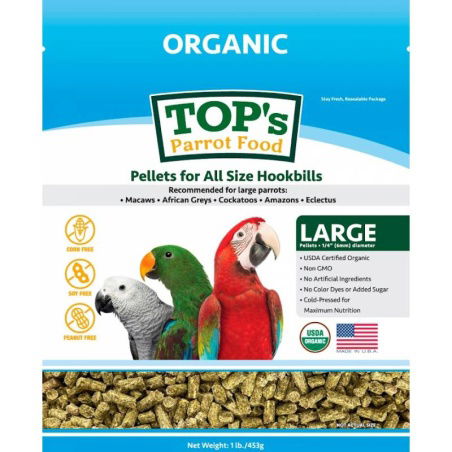 Ontdek TOP’s Parrot Food Medium / Large Pellets, een premium vogelvoeding speciaal geformuleerd voor middelgrote tot grote papegaaien. Deze voedingsrijke pellets, verpakt in een zak van 453 gram, zijn ontworpen om aan de specifieke voedingsbehoeften van grotere vogelsoorten te voldoen. Ze bevatten geen kunstmatige toevoegingen zoals kleurstoffen, conserveringsmiddelen of smaakstoffen, waardoor ze een gezonde keuze zijn voor je gevederde vriend.